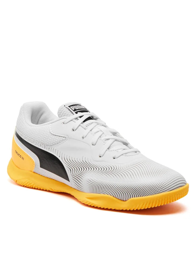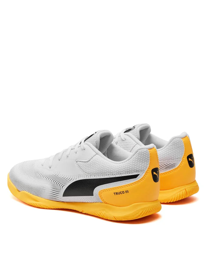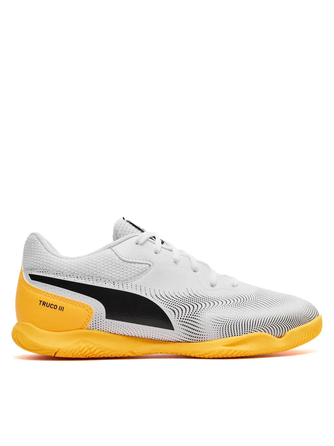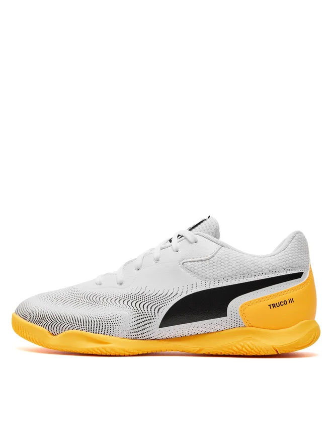 Lleva tu juego al siguiente nivel con las Puma Truco III, las botas de fútbol sala diseñadas para jugadores que buscan agilidad, control y un toque de velocidad explosiva. Este modelo combina una estética moderna en blanco y negro con detalles vibrantes en "Sun Stream" (amarillo solar), asegurando que destaques tanto por tu técnica como por tu estilo.