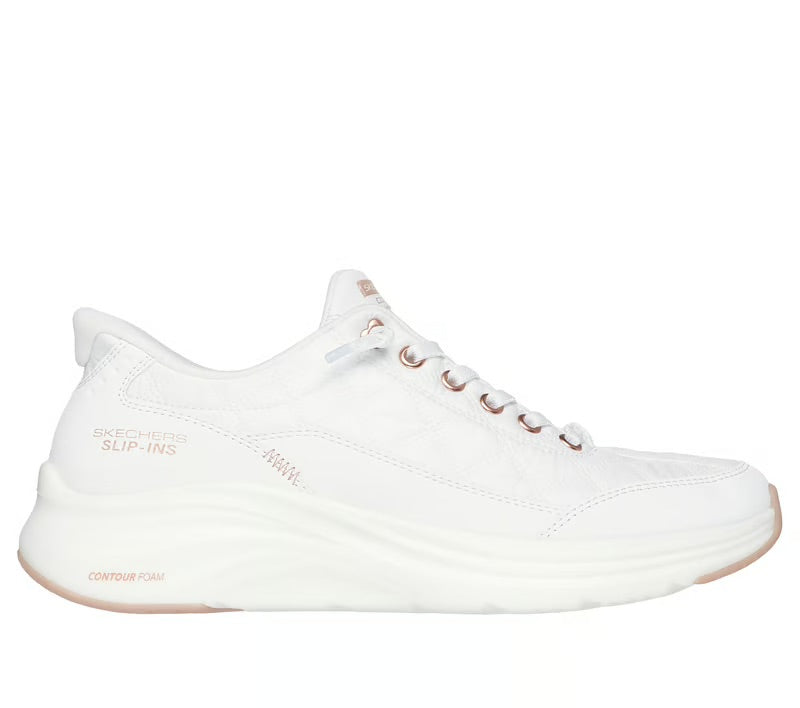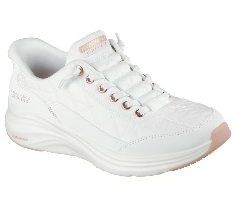PUFFER FIT™ Adéntrate en la lujosa y acogedora comodidad de las Skechers Hands Free Slip-ins®: Contour Foam™ - Cozy Fit™ Golden Hour. Diseñado con nuestro Heel Pillow™, este modelo sin cordones presenta una parte superior acolchada Cozy Fit™ y una capa superpuesta de duraleather con cordones elásticos ya atados, amortiguación Contour Foam™ en la media suela y nuestra característica plantilla con amortiguación Skechers Air-Cooled Memory Foam™.