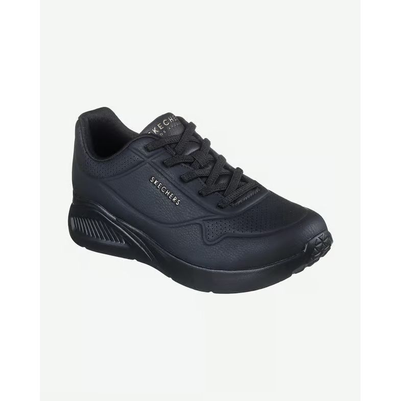Sube de nivel con las zapatillas Skechers Uno Lite Work. Esta zapatilla de moda con cordones elásticos presenta una parte superior de cuero sintético con una entresuela acolchada con cuña de plataforma y una plantilla Die-Cut Skechers Memory Foam.